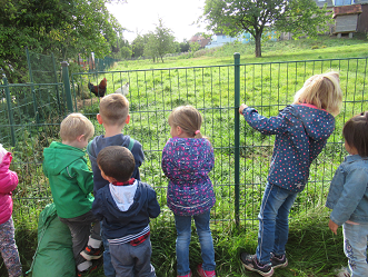 Alle Gruppen sind noch in der Phase der Eingewöhnung der neuen Kinder. Trotzdem konnten schon erste Ausflüge in den Kurpark und zu dem Freilauf der benachbarten Hühner unternommen werden.