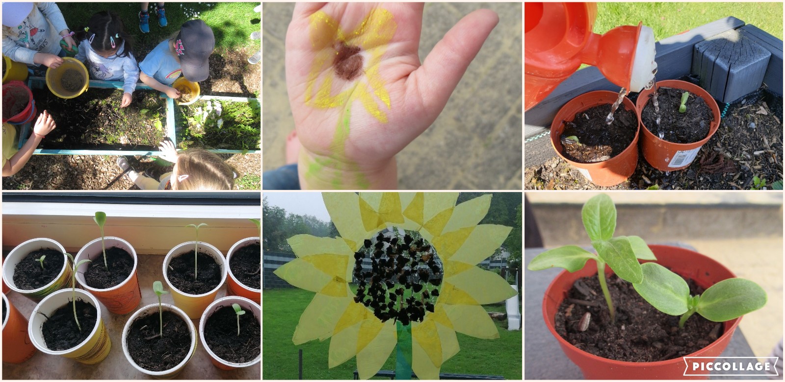 Vor einiger Zeit hat uns der Hermannshof einige Sonnenblumenkerne geschenkt. In allen drei Gruppen wurden diese mit den Kindern gepflanzt. Die Regenbogenkinder haben die Kerne in Blumentöpfen in der Gruppe gepflanzt. Die Wiesenkinder haben ihr Hochbeet dazu verwendet und die Blümchenkinder beobachten das wachsen auf dem Außengelände in Blumentöpfen. Einige Kinder haben eine große Sonnenblume am Fenster entstehen lassen und andere haben ein Sonnenblumen-Fingerspiel kennengelernt. Jetzt hoffen wir, dass die Sonnenblumen gut wachsen und uns bald mit ihrer Blüte erfreuen.