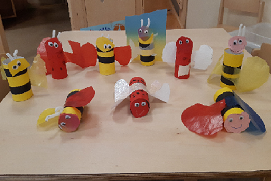Die Kinder konnten bei Sonnenschein und Regenwetter auf unserem Außengelände frei spielen. Wir haben an der Matschanlage gespielt, Geschichten gelesen und aus Klopapierrollen wurden Rennautos, Bienen und Marienkäfer gebastelt. Außerdem wurde ein neues Fingerspiel kennengelernt.