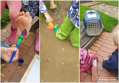 In unserer ersten Ferien-Notgruppe waren wir viel mit den Kindern auf dem Außengelände. Die Kinder konnten zum Beispiel bunte Fußabdrücke gestalten und in den vielen Pfützen spielen. Außerdem wurden zahlreiche Schnecken gefunden. Für Aufregung hat ein Waschbär gesorgt, welcher nicht mehr aus unserer grünen Mülltone kam. Er konnte zum Glück fachmännisch gerettet werden und wird nun vielleicht zum Filmstar in einer Naturdoku.