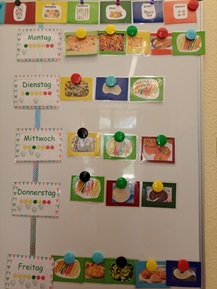 Da die KiTa Kinder noch nicht lesen können, aber immer großes Interesse daran haben, was es am Mittag zu Essen gibt, wurde im Ü3 Flur eine Magnetwand angebracht. An dieser Wand können die Kinder u.a. bereits am Wochenanfang den Speiseplan anhand von Bildern betrachten.